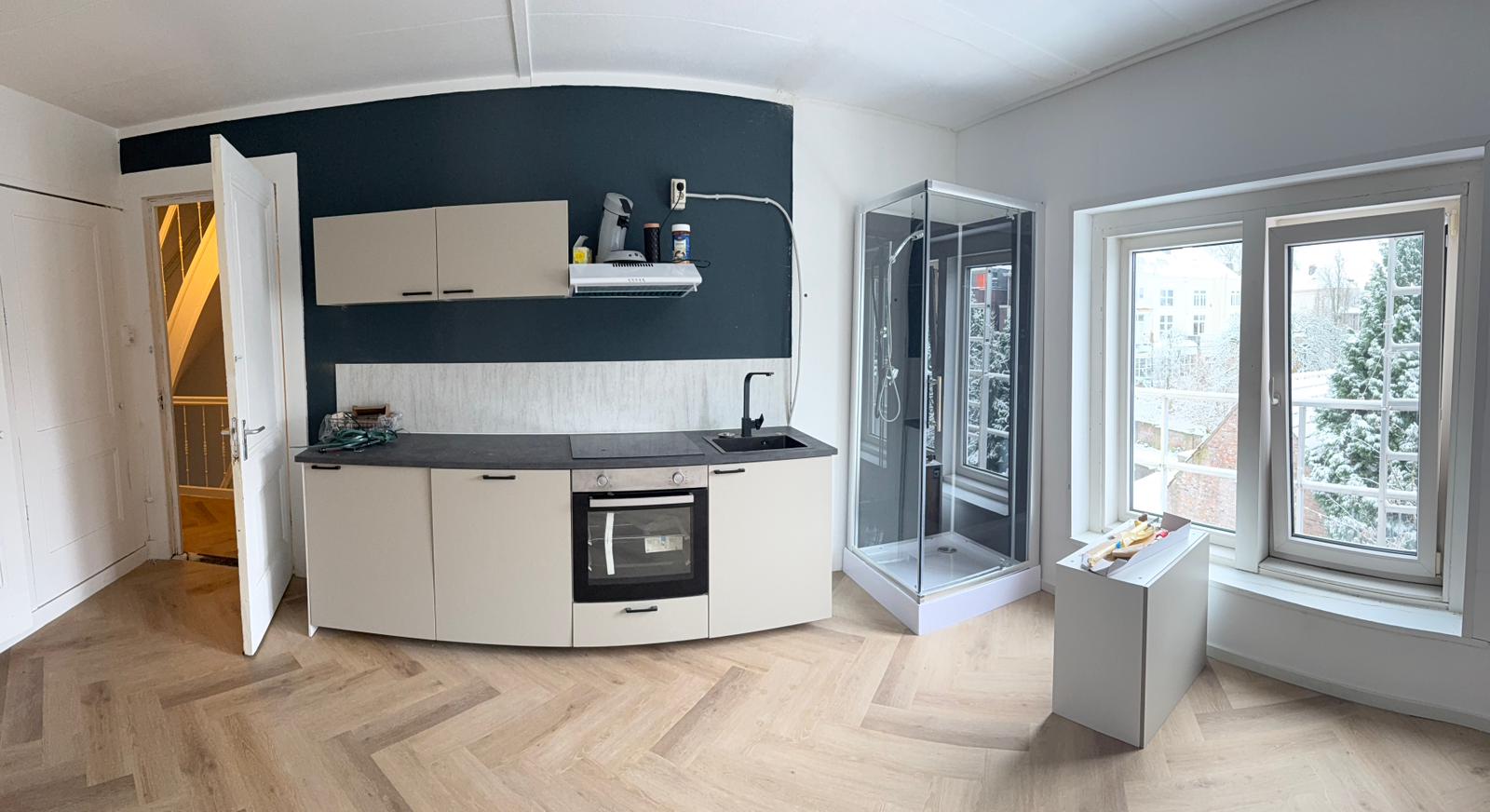 De bovenste verdieping heeft 2 clienten kamers (langdurigverblijf) met eigen keuken en gedeelde badkamer en wc.
